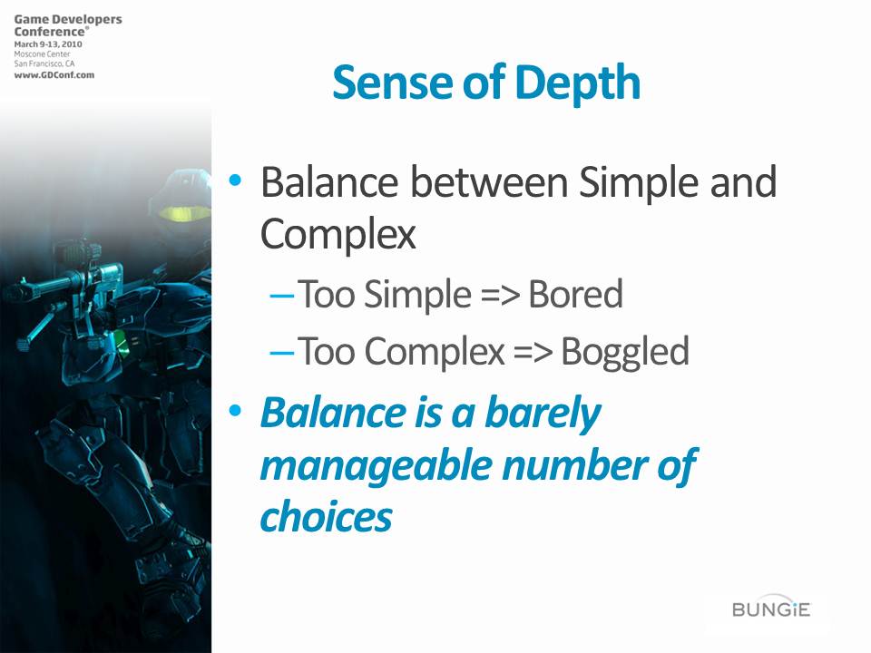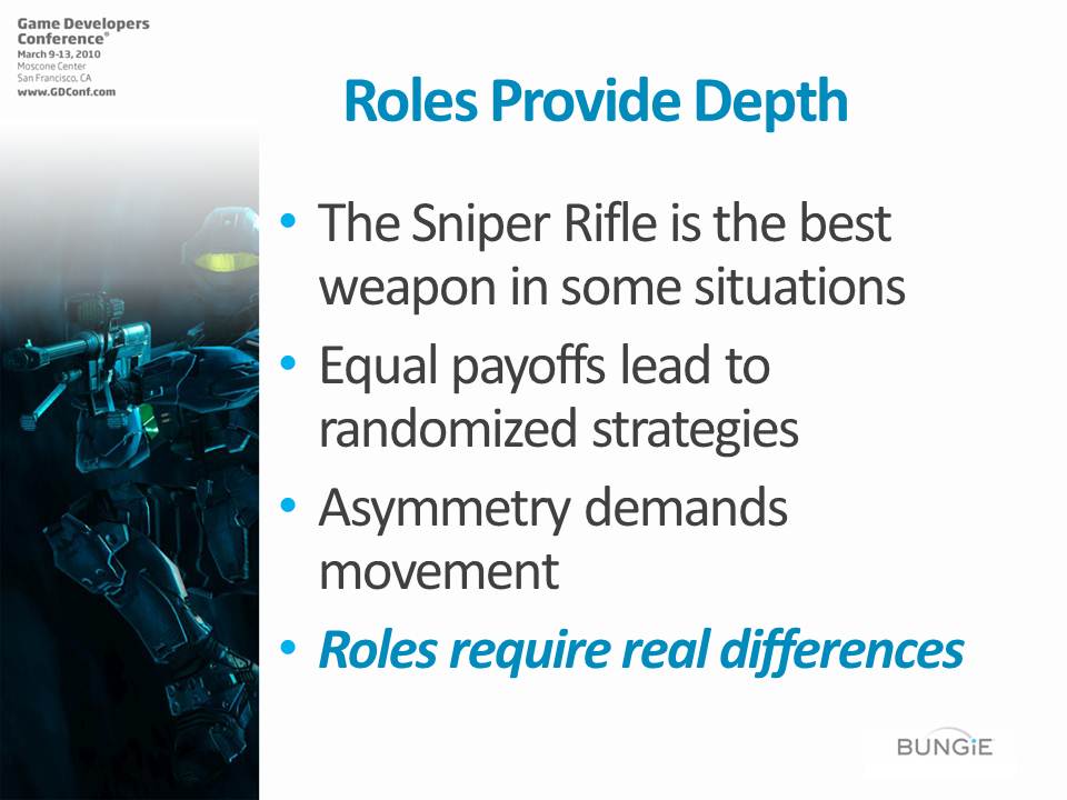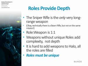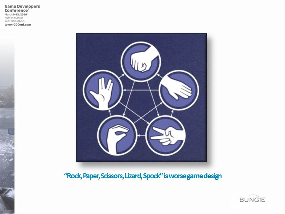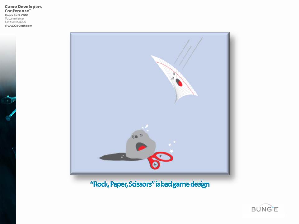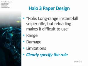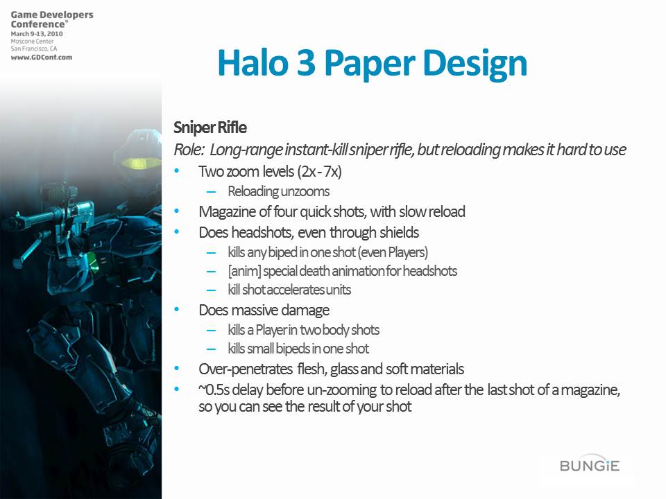 Using simple language without rich connotations also helps avoid two common communication problems. First, it leaves programmers less room for interpretation. A paper design that describes a weapon as “powerful” could be implemented in many ways, but one that says “does enough damage to kill a player in one shot” only allows for one. Simple language also allows artists more room for interpretation. A paper design that calls for “a spider with human hands” will probably end up with a pretty silly looking model, but one that describes “a multi-legged creature capable of carrying an infantry weapon” will give the artist more freedom to make something aesthetically interesting.